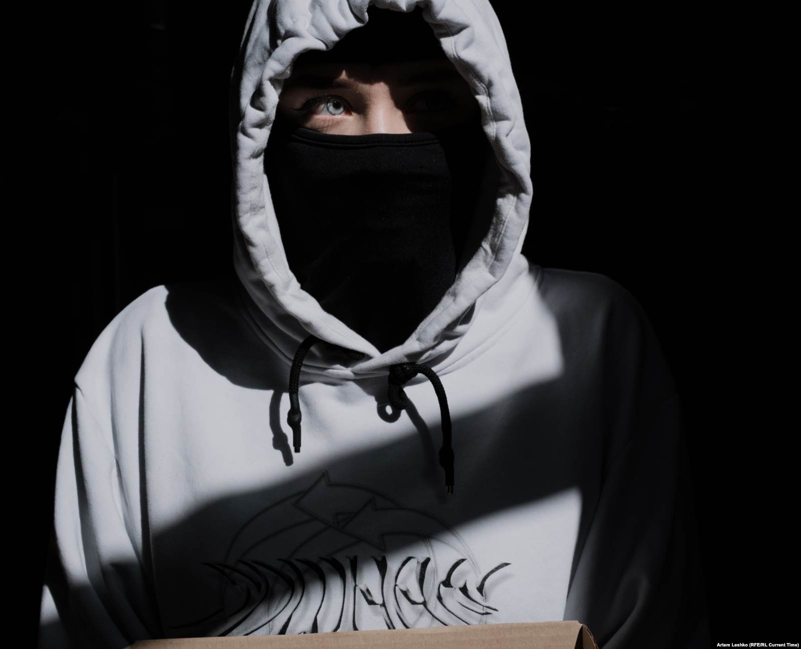 Девушка сидит на деревянном полу, вокруг – коробки, пакеты, блестящие блистеры таблеток. Из-под скрывающей лицо балаклавы – спокойный взгляд голубых глаз.